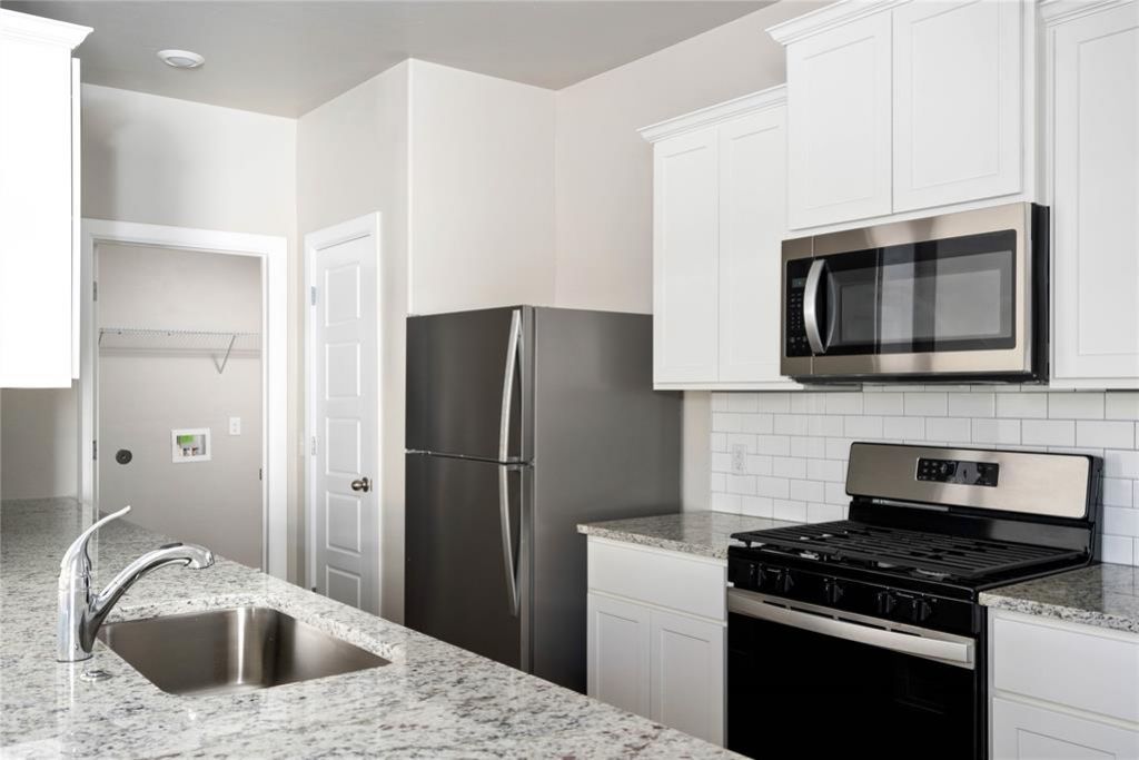 This beautifully designed single-story home offers a modern open-concept layout, seamlessly connecting the living, dining, and kitchen areas-perfect for both everyday living and entertaining. The kitchen features granite countertops, white cabinetry, a subway tile backsplash, stainless steel appliances (including a refrigerator), and a spacious island with a sink and bar seating.The private owner's suite is thoughtfully positioned and includes a large walk-in closet and an attached bathroom with a granite-topped vanity and walk-in shower. Additional bedrooms provide flexibility for guests, a home office, or hobbies.Interior finishes include durable luxury vinyl plank flooring in the main living areas, plush carpet in the bedrooms, and neutral tones throughout. A dedicated laundry room adds convenience to daily routines.Exterior features include a charming covered front entry, an attached two-car garage, and a fully fenced backyard with plenty of space to enjoy outdoor living.This home also includes energy-efficient features and modern conveniences designed to enhance comfort and value. Conveniently located with easy access to major highways, shopping, and dining.