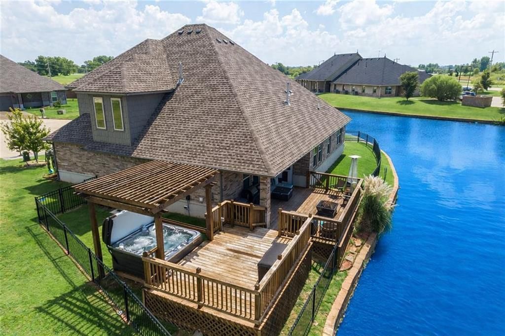 OPEN HOUSE SUNDAY 2-4PM. If you've ever dreamed of living on a lake vacation everyday - here's your chance. Easy access to the highway - great location. You can literally cast a reel from your back deck and feed the fish. Enjoy sunsets over the lake from your huge deck hot tub. 3 bed+flex room (or 4bed) + Bonus Room. Spacious utility connects to primary closet. Spa-like master retreat with Whirlpool tub. Lower level study/home office makes great nursery, exercise, tv or guest room. Upper level has 2 true bedrooms, full bath and awesome theater room Open floorplan with kitchen open to living room. Hardwood floors, granite countertops, SS appliances, large pantry and sunlit windows with a beautiful view. Quiet one-street gated community with easy access to Kilpatrick Turnpike, Yukon High School and I-40.