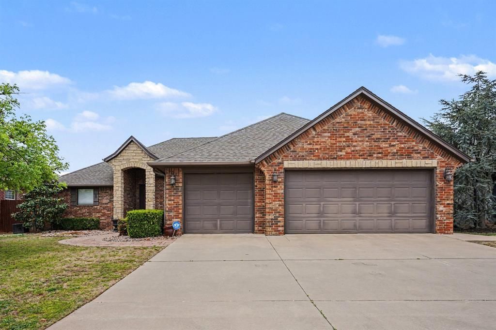 Beautiful custom home in Sonoma Lake featuring upgraded finishes and thoughtful design throughout. Rich knotty alder woodwork, elegant stone accents, and stained concrete flooring create a warm and refined interior. The spacious living area offers a gas fireplace and large windows with views of the private backyard, while the gourmet kitchen includes a center island, breakfast bar, granite countertops, stainless steel appliances, and a walk-in pantry with abundant storage.The primary suite provides a relaxing retreat with vaulted ceilings, an ensuite bath with double vanities, soaking tub, separate shower, and a large walk-in closet with built-ins. A versatile office with a closet can serve as a fourth bedroom or ideal work-from-home space. Two additional bedrooms are situated on the opposite side of the home for added privacy.Outside, professionally landscaped front and backyards feature stone pavers and seasonal rye grass, along with a welcoming covered front porch and striking masonry details. Additional highlights include a laundry room with utility sink, a storm shelter, and a three-car garage. Located in the highly regarded Edmond school district, this meticulously maintained home offers both comfort and style.