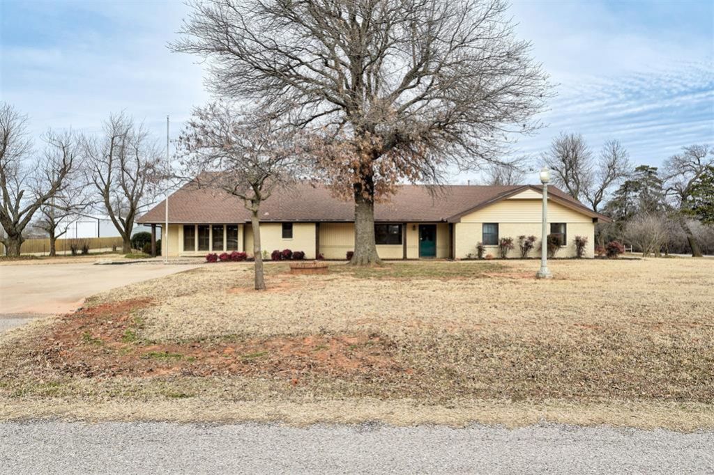 You MUST see the stunning two-story vaulted wood-plank ceiling in this custom home, offering instant equity. This exceptional property includes a 4-bedroom, 3-bath, 4-half-bath home, a 4,000 sq ft warehouse/shop, and a separate horse stable, all situated on a 2.05-acre corner lot. The home features two large living areas, an open-concept granite kitchen with two dining areas, an expansive butler's pantry, and a 3-car garage with tool room & half bath. The upstairs loft is ideal as a second primary suite or for multigenerational living, offering its own living area, eating space, bedroom, bathroom with sunken tub and roll-in shower, second laundry room, abundant closets and built-ins, cedar closet plus its own private entrance. Notable updates include three fireplaces, all new electrical outlets and switches, new light fixtures and chandeliers, fresh interior and exterior paint, new septic lines, a new 2025 range, brand-new carpet, a 2021 roof, and new HVAC. The beautifully landscaped acreage features mature redbud, pear, and berry trees surrounding a tranquil fountain and koi pond with stamped concrete patio. The massive warehouse/shop sits on a concrete foundation with multiple garage bays, including a boat bay, new lighting, plumbing, extensive storage capacity, and a private driveway. Ideal for an at-home business or car & toy enthusiasts. The 7-stall horse stable includes a tack room with bathroom, and concrete drive-through for trailers. Located in top-rated Mustang schools with quick access to the freeway and tollway. Just 20 minutes to downtown OKC, 10 minutes to the airport, and 25 miles to Tinker AFB.