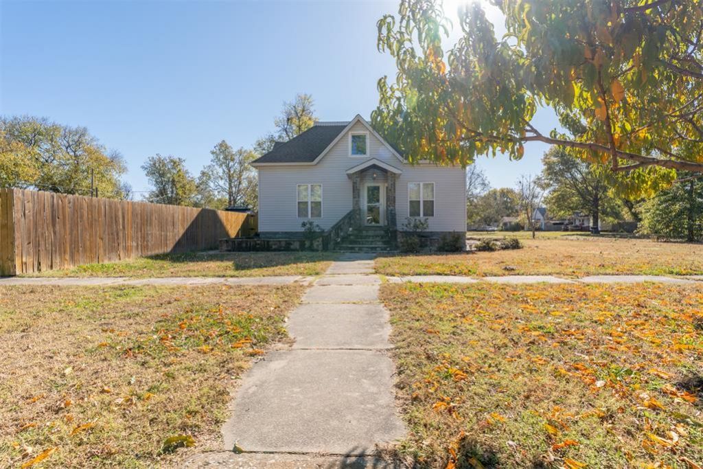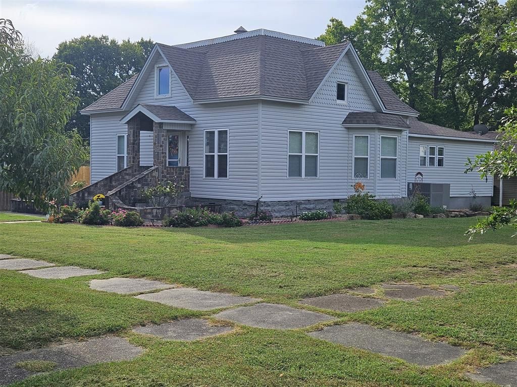 This beautifully updated three-bedroom, two-bath home is full of character, charm, and thoughtful improvements throughout. The inviting entryway is highlighted by unique standing rockwork equipped with lights that adds warmth, personality, and curb appeal the moment you arrive. The flower beds are established with many perennial plants and flowers. There are also several fruit trees planted around the property including one cherry and two peach. Inside, the main level offers 2 bedrooms, 2 bath with central heat and air, stunning refinished hardwood floors, 9' tall ceilings, and gorgeous crown molding and woodworking that showcase the home's classic appeal. The ceiling in main living room is a must-see with remarkable detail and design. The upstairs features a spacious bedroom with abundant closet space and its own Lennox mini-split for customized heat and air comfort, dedicated to the upper level. The kitchen is generously-sized and features a large walk-in pantry, a newer kitchen stove, and a newer Bosch dishwasher. Both bathrooms have been updated, and the home has fresh interior paint, making it truly move-in ready. Outside, the fully fenced backyard includes a nice privacy fence and a beautiful new pergola equipped with electricity and a ceiling fan-perfect for outdoor entertaining or relaxing evenings. Additional exterior perks include a two car carport, extra rear parking, and a storage building with electric. Roof was new in 2018. Modern upgrades such as some PEX plumbing, newer electrical, newer 50 gallon hot water tank, and two and half year old HVAC unit are some of the many additional enhancements that make this home a perfect blend of historic charm and contemporary comfort. Centrally located between Tulsa and Oklahoma City, easy access to Interstate 40 for the commuter.