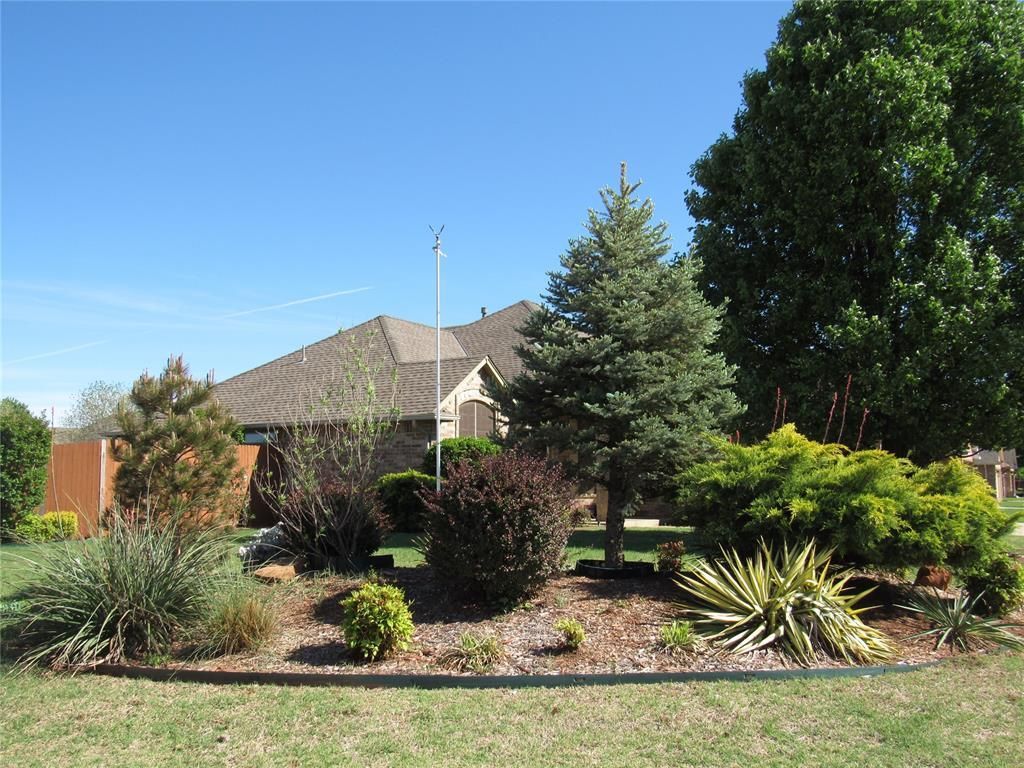 Move In Ready! Motivated Seller! Welcome to this immaculate one owner home on a large landscaped corner lot! This home has 3 generously sized bedrooms PLUS a dedicated home office with French doors and hard wood floors. This home was built with quality craftsmanship by award winning builder Jeremy Hill. As you step into the home you will notice the cozy living room with the charming gas fireplace. You will enjoy cooking in this kitchen with granite counter-tops and large pantry. Do you have lots of clothes? Need more storage? No problem! The primary suite offers a sizable bedroom, whirlpool tub, and HUGE Australian closet with built-ins. AND both hallways have additional storage cabinets. The large utility room features a mud bench and a utility sink right off the 3 car attached garage. Outside the surround sound from the living room extends to the over-sized covered patio area. The yard has a sprinkler system and a spacious 12 x 16 outbuilding for equipment and hobbies. Neighborhood Amenities include a playground, picnic area, pavilion, basketball courts, and dog park within walking distance of the home. Property is conveniently located in Mustang School District (buyer to verify school district).
