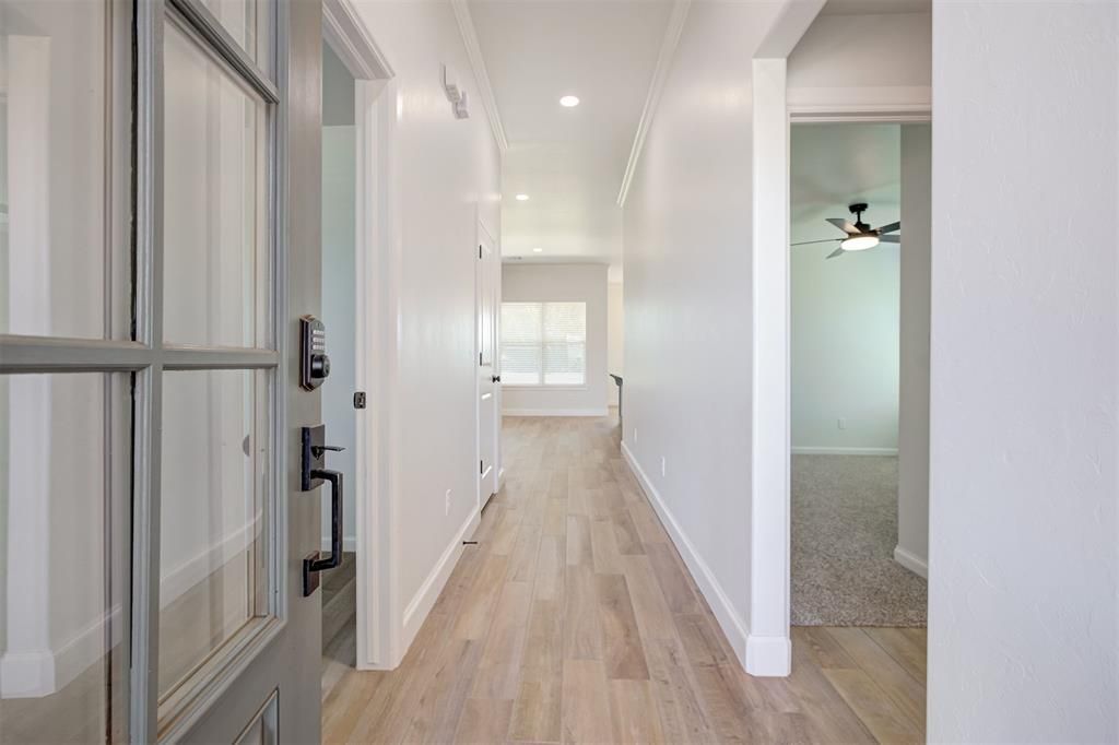 Welcome to your dream home in the brand-new Hux's Grove subdivision, just 2 miles west of the entrance to Winter Creek Golf Club. With 4 spacious bedrooms, 2.5 baths, and 1,907 sq. ft. of thoughtfully designed living space, this home has room for everyone to relax and unwind.The kitchen features sleek quartz countertops, a designer white tile backsplash, crisp white upper cabinets paired with SW Retreat (a gorgeous green-gray) lower cabinets, and stainless steel appliances. Elegant brushed gold hardware and lighting add a sophisticated touch throughout.Your primary suite is a private retreat with dual vanities, a tiled walk-in shower with built-in bench and counter space. The walk-in closet includes a built-in dresser, providing stylish and functional storage. Step outside to enjoy a covered back patio overlooking your .56-acre lot, complete with a black chain-link fence that keeps the view open and unobstructed. The 3-car garage includes a passthrough in the 3rd bay-perfect for easily moving a lawnmower or outdoor equipment.Don't miss your chance to call this beautiful Blanchard property your new home sweet home!