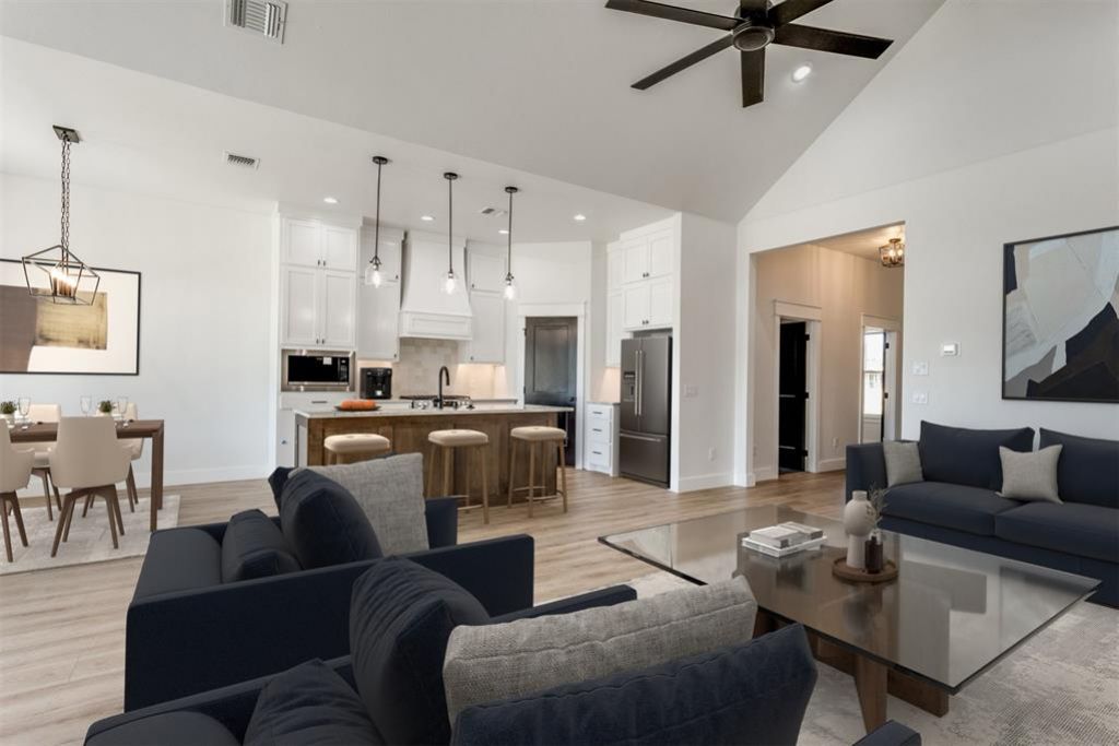 This beautiful waterfront home features an open floor plan with an impressive vaulted ceiling in the living/kitchen space, creating a bright and airy atmosphere. Expansive windows illuminate the kitchen and living area, offering beautiful views of the covered back patio over looking the water. The large kitchen is equipped with state of the art appliances, complemented by a spacious center island. The primary suite is a true retreat, showcasing a standalone tub, double head walk-in shower, and an oversized walk-in closet. Additional features include a beautifully designed fireplace, powder bath, conveniently located mud bench/drop zone, designer lighting, recessed can lights, gorgeous tiles, beautiful granite countertops throughout, and much more! **For a limited time only, we are offering a $3,000 Builder's Special and $13,691 Early Bird special. Builder will pay closing cost with preferred lender partners. Home is MOVE IN ready ! Come tour this gorgeous home today!