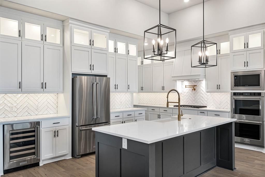 Experience the perfect balance of sophistication and comfort in this stunning home located on the scenic golf course of a gated community. This thoughtfully designed single-story showcases elegant craftsmanship, timeless finishes, and an open-concept layout ideal for both entertaining and relaxing. Step inside to a bright, airy living area anchored by a modern shiplap fireplace, oversized windows with tranquil golf course views, and sleek wood flooring throughout. The designer kitchen is a chef's dream-featuring a grand quartz island, custom cabinetry extending to the ceiling, a herringbone backsplash, built-in double ovens, and a wine fridge for easy hosting. The private owner's suite is a true retreat with tray ceilings, wood beam accents, and spa-worthy en suite featuring a freestanding soaking tub, glass-enclosed shower, dual vanities, and an expansive walk-in closet. Step outside to your covered patio with a built-in grill-perfect for relaxing evenings overlooking the fairway. With its upscale finishes, designer lighting, and stunning curb appeal, this home is a masterpiece inside and out. Live the lifestyle you deserve-schedule your private tour today!