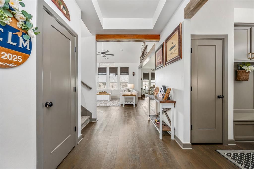 Modern farmhouse-style 3-bedroom home with thoughtful design and quality finishes throughout. The living room features a cathedral ceiling, wood beam, and a stunning floor-to-ceiling fireplace, creating an open yet inviting focal point. The kitchen is built for both everyday living and entertaining with a gas cooktop, floor-to-ceiling cabinetry, quartz countertops, oversized island, and pantry. The primary suite offers a private ensuite with a beautifully tiled glass-enclosed shower and dual sink vanities. Upstairs includes an oversized landing with flexible space. Additional features include custom blinds, tankless hot water heater, smart home app control for the garage and oven, and a garage with extra storage space plus an in-ground storm shelter. Enjoy outdoor living on the large extended concrete patio overlooking the neighborhood pond. Located in the Valencia community with access to lakes, fitness trails, splash pads, and parks. Come see everything this home has to offer - schedule your private showing today!