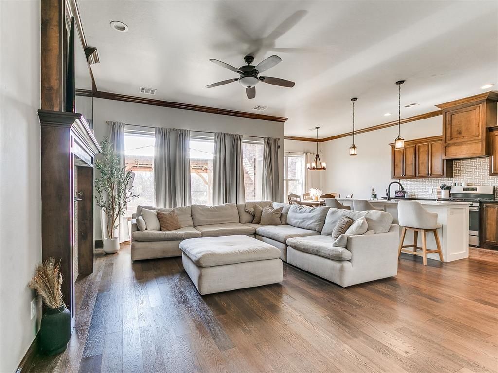 If location matters to you, Timbercreek Estates delivers. A pool, splash pad, park, and basketball court are just steps away, and the neighborhood has the kind of community energy that makes a house feel like a home before you even walk through the door. Tucked away in the heart of it all is this beautiful 3 bedroom, 2 bathroom home (plus an office) that brings traditional style and farmhouse character together in all the right ways.Hard flooring and an open, flexible layout greet you at the entry. A private study sits just off the front with double doors, crown molding runs throughout, and large windows flood every bedroom with natural light. The kitchen is thoughtfully designed with stainless steel appliances, plenty of cabinet space, and an eat-in island that makes entertaining effortless. Retreat to the primary suite and find a tray ceiling, double vanities, a tiled shower, a soaking tub, and a built-in walk-in closet. The laundry room includes a folding table and mud bench because the details matter here. The backyard patio overlooks a greenbelt, offering privacy and peace in equal measure and a recently installed storm shelter provides peace of mind. This is the one you have been waiting for.