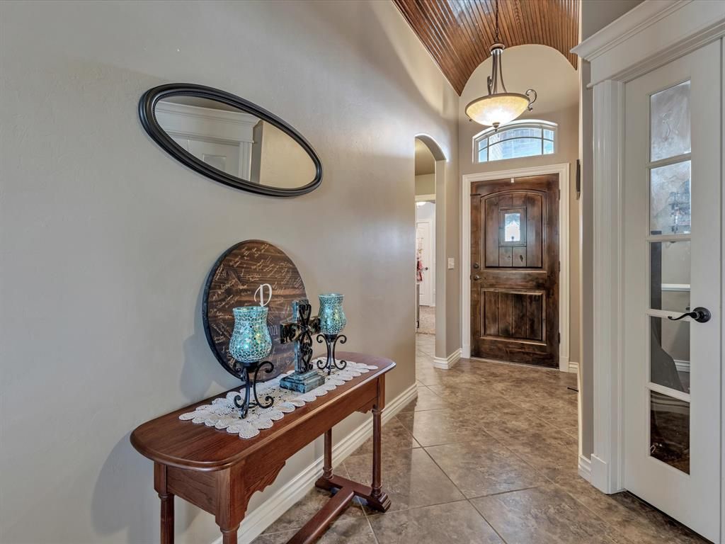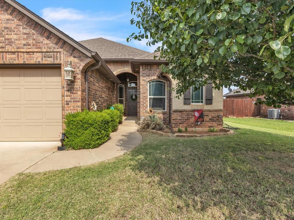 Beautiful Timber Creek home in Mustang Schools offering 4 bedrooms or 3 bedrooms plus a study, with great curb appeal and a warm, inviting layout. The foyer features a stunning wood ceiling and tile flooring, opening into a spacious living room with tray ceilings and a cozy brick fireplace. The kitchen is beautifully finished with granite countertops, tile backsplash, recessed lighting, and crown molding. The private primary suite includes a walk-in shower, whirlpool tub, dual sinks, and a large walk-in closet. You'll also love the functional laundry room with a mud bench and plenty of storage. Additional highlights include a storm shelter in the garage floor, a covered back patio, and access to the neighborhood pool and playground. Conveniently located near shopping, highways, and schools, this home offers comfort, style, and versatility all in one. Seller offering $2,000.00 to go towards flooring!