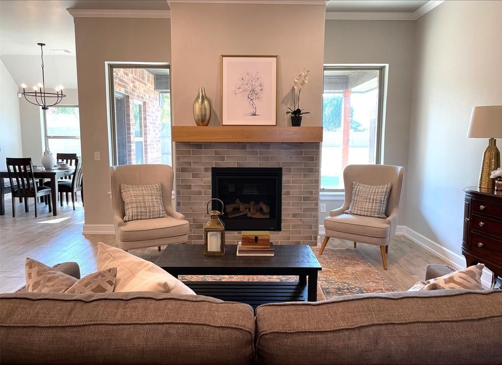 Step into your dream home with the stunning Fenwick floor plan, nestled in the highly desirable Castlewood Trails community. This charming farmhouse-style residence boasts a spacious three-car garage and a welcoming front porch that sets the tone for what's inside. Just beyond the entryway, discover a versatile flex room with elegant French doors-ideal for a home office, creative studio, or a fun-filled playroom. The living room, with a gas fireplace and wood tile floors, seamlessly flows into the kitchen with a large island, and quartz countertops. The dining room, with ample natural light, accesses the back patio, making it great for entertaining. The primary suite features a 6ft tub, walk-in shower with Schluter waterproofing, and a spacious walk-in closet with direct access to the laundry room. The other two bedrooms occupy the opposite side of the home, sharing a full bathroom and extra linen closet. Close to the garage entry, you'll find a mudroom, coat closet, and half bath. Some other features include a smart system, a healthy air filtration system, a tankless water heater, and sprinkler system. This Zero Energy Ready Home is unrivaled among other energy-efficient homes with its superior design and construction. Adhering to the highest standards for energy efficiency, comfort, and air quality, it promises long-term savings. Some innovations include a thermal enclosure with 2x6 walls and spray foam insulation, a water and moisture barrier, ENERGY STAR appliances, high-performance windows, a perfectly sized HVAC system, post-tensioned foundation and so much more.
