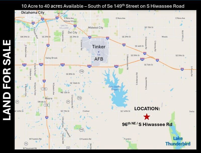 10 ACRES RURAL PARADISE EAST OF NORMAN NO RESTRICTIONS ZONED A-2 with up to 40 acres available!Own your own slice of Oklahoma heaven just 15 minutes east of Norman! This 10 acre tract offers the perfect blend of privacy, elevation, and convenience - nestled between Stanley Draper Lake and Lake Thunderbird in one of Cleveland County's most scenic areas. This property features rolling terrain, mature trees, and a beautiful pond - ideal for livestock, fishing, or simply relaxing by the water. With no HOA, no flood zone, and no restrictions, you have complete freedom to build your dream home, establish a hobby farm, or create your own secluded retreat surrounded by nature.The A-2 Rural Agricultural Residential zoning supports a wide range of uses while maintaining a peaceful country atmosphere. Enjoy breathtaking panoramic views and stunning Oklahoma sunsets from your elevated homesite. Located just 13 miles from Moore, 16 miles from the University of Oklahoma, 25 miles from downtown OKC, and less than 10 miles from Lake Thunderbird State Park, this property combines quiet country living with quick access to city amenities and major highways, including I-40. Don't miss this rare opportunity to own a truly exceptional piece of land in one of Norman's most desirable rural settings - where your vision for country living can become reality. Buyer Brokers welcome - please note that well and septic/aerobic by buyer!