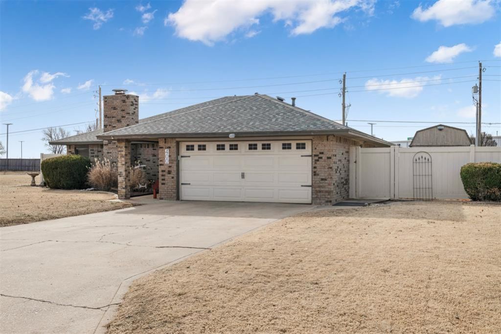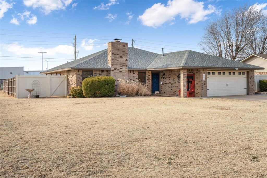 3 Bedroom 2 bath home with a 2-car garage for sale in Elk City, Oklahoma. Step into this very well-kept home with modern farmhouse charm. Entering the home, buyers will be welcomed with a trey ceiling in the living room and wood burning fireplace with built in shelving on both sides. The open floor plan leads to the kitchen that is designed with granite counter tops, plenty of cabinet and counter space and access to the back patio with double patio doors. In addition, there are shortened barn doors to add flare and charm to the dining and kitchen area. The larger primary bedroom has a walk-in closet and trey ceiling with access to the primary bathroom that has a shower/tub combo. With vinyl tilt in windows, natural lighting makes this home so invitingThe privacy fenced backyard has a 16 x 12 storage building to help with all your storage needs.Come see this home today! Home qualifies for FHA, VA, USDA, Conventional loans.