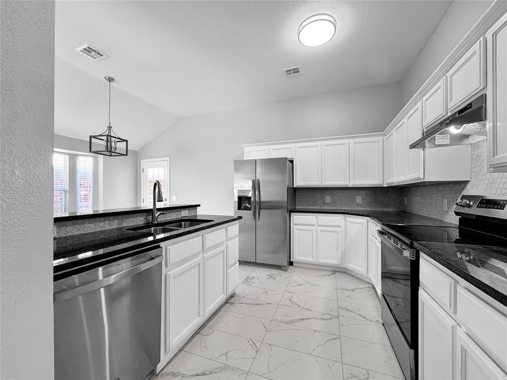 Charming 4 bedroom, 2 bath ranch with a classic brick front and 2 car garage! Step inside to a bright, inviting living area featuring an oversized window and cozy fireplace accent. The modern kitchen impresses with marble inspired tile flooring, crisp white cabinets, sleek black countertops, and all essential kitchen appliances. Retreat to the primary bedroom with raised ceilings, while all bedrooms offer plush carpeting. Enjoy a fully fenced private backyard, perfect for gatherings or quiet relaxation. A beautiful blend of style, comfort, and functionality!