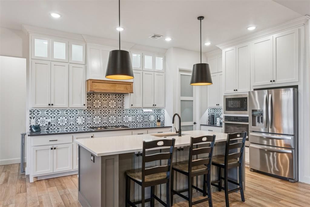 Prepare to be impressed by this nearly new home in the Mustang School District on a .21 acre lot! Instantly you are welcomed by stunning custom modern garage doors, lush landscaping, and a beautiful brick archway. Step inside to a dedicated foyer that opens into a spacious living area filled with natural light from large windows that frame a gorgeous brick fireplace with wood mantle. A matching wood beam accenting the vaulted ceiling adds warmth and charm. The open-concept design seamlessly connects the living room to the kitchen and dining area. The kitchen is truly the heart of the home, featuring a massive island, white painted cabinetry extending to the ceiling for added visual height, and built-in stainless steel appliances including an oven, microwave, and gas range. A decorative vent hood and stylish backsplash complete the contemporary design. The primary suite offers a relaxing retreat with a tray ceiling, ceiling fan, and plush carpeting. A sleek barn door leads into the spa-like ensuite, showcasing modern dark gray tile, a double sink vanity, soaking tub, and a striking white subway-tiled walk-in shower. The oversized primary closet provides abundant storage with hanging space, a built-in dresser, and shoe racks. Conveniently, the closet flows directly into the well-equipped laundry room, which also connects to a junior office and additional storage space. Down the hall, you'll find a powder bath, along with a mud bench just off the garage to help keep everyday items organized. Wood-look tile flooring runs throughout the main living areas and hallways for both style and durability. Two additional bedrooms with spacious closets share a full bathroom. At the back of the home, a versatile bonus room provides the perfect space for a media room, playroom, or hobby area. Step outside to enjoy the beautifully designed Trex deck that expands the covered back porch. The expansive backyard is fully fenced and includes a storage shed for added convenience.