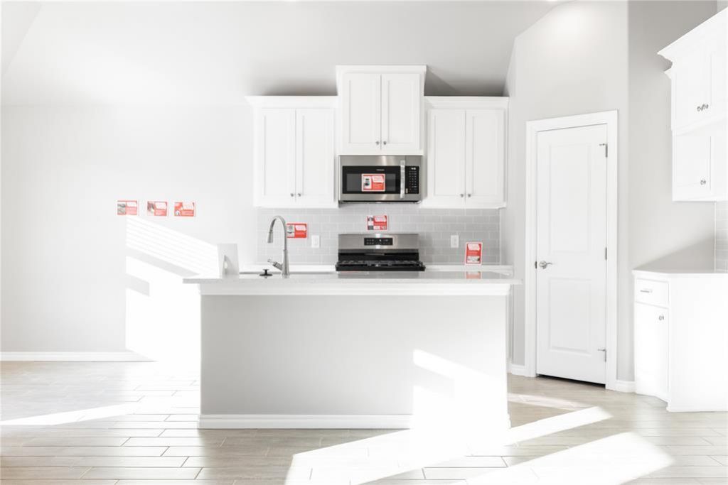 FENCING AND BLINDS INCLUDED! This Bogan floor plan includes 1,510 Sqft of total living space, which includes 1,400 Sqft of indoor living space and 110 Sqft of outdoor living space. There is also a 395 Sqft, two-car garage with a storm shelter installed. This home offers 3 bedrooms, 2 bathrooms, 2 covered patios, an office, and a utility room. The living room welcomes wood-look tile, large windows, a ceiling fan, and Cat6 wiring. The kitchen has 3 CM quartz countertops, stainless-steel appliances, wood-look tile, custom-built cabinets with decorative hardware, and stylish tile backsplash. The primary suite features noteworthy carpet flooring, a ceiling fan, Cat6 wiring, and perfect-sized windows. The upgraded primary bath offers a dual sink vanity with an elegant countertop selection, a tub/shower combo, an elongated water-saving toilet, and a walk-in closet! The outdoor living area is covered and has fully sodded yards with a water saving sprinkler system. Other amenities include a tankless water heater, a fresh air intake ventilation system, R-15 and R-38 insulation, an air filtration system, and so much more!