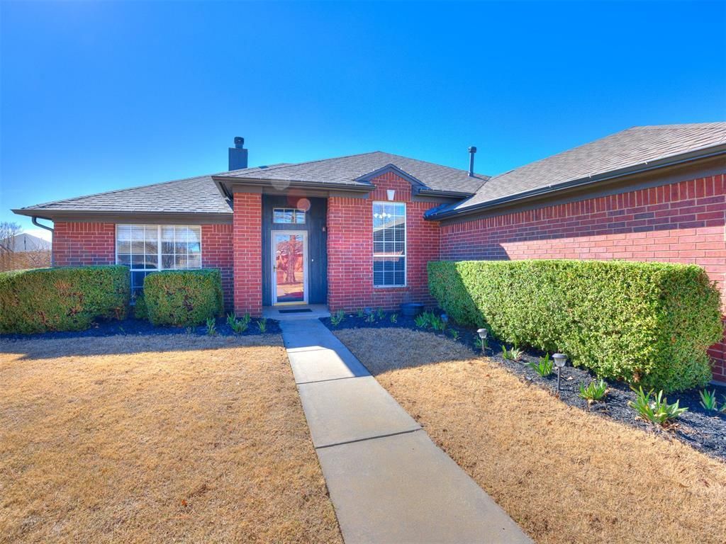 Welcome home to this well-maintained true 4-bedroom, plus a study, 2-bath residence on a desirable corner lot in a gated community. Featuring an open and functional floor plan, this home offers a spacious living area with a fireplace, perfect for relaxing or entertaining. The kitchen flows seamlessly into the dining and living spaces, creating an inviting layout for gatherings. The private primary suite includes a walk-in closet, dual vanities, and a jetted tub for added comfort. Three additional bedrooms provide flexibility for guests, a home gym, or hobbies. Enjoy outdoor living on the extended concrete back patio, fully covered by an awning, offering the perfect space for grilling, entertaining, or relaxing year-round. Additional highlights added in 2025, a new electrical panel, whole home surge protector & garage door motor. Conveniently located near major highways, shopping, dining, and within the Mustang School District. This home combines comfort, convenience, and community - a must-see!